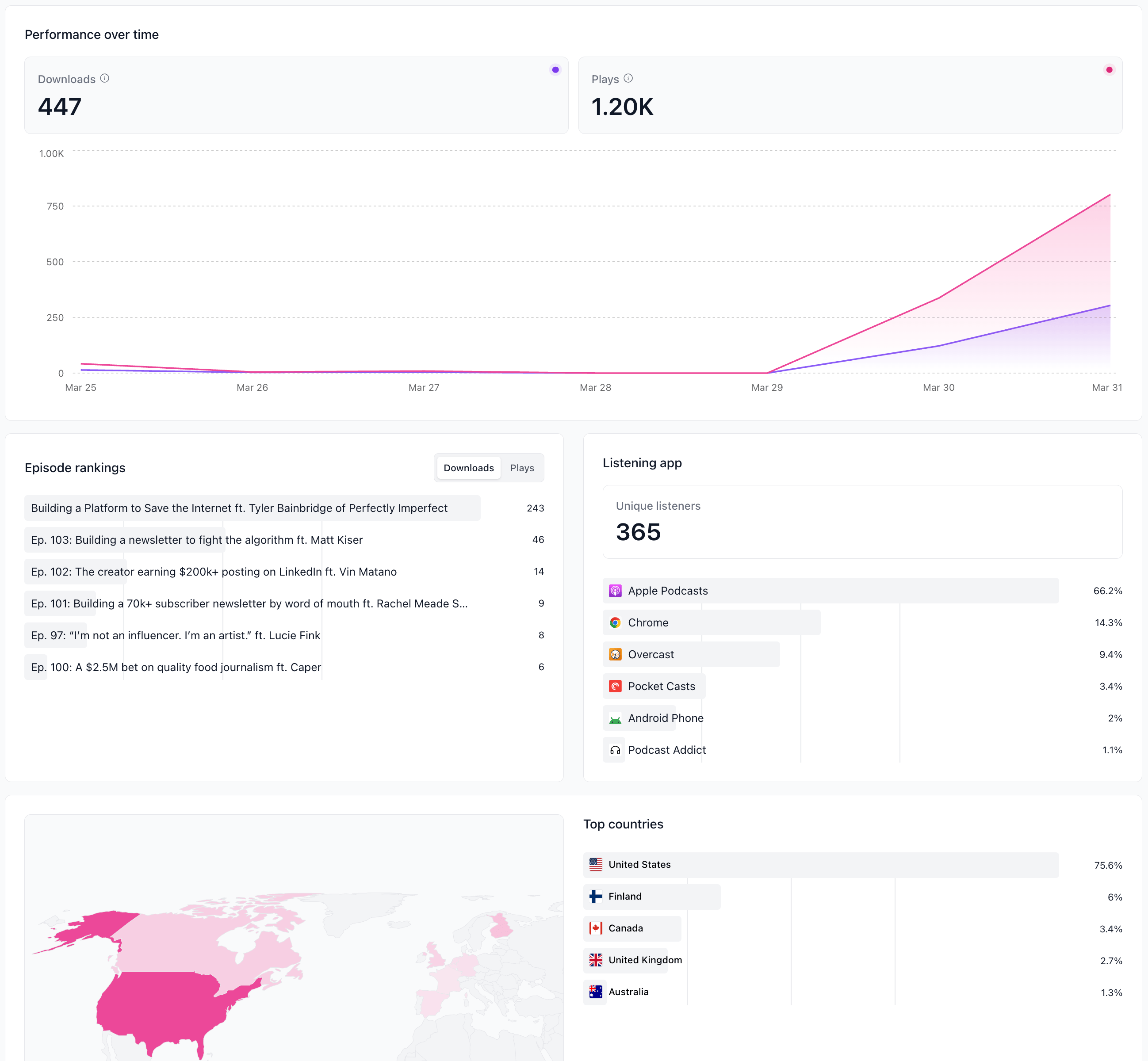 Our podcast analytics are built to IAB standards, with breakdowns by country, listening app, device, and operating system, plus episode-level downloads and real-time data. No more waiting 24 hours for reports.