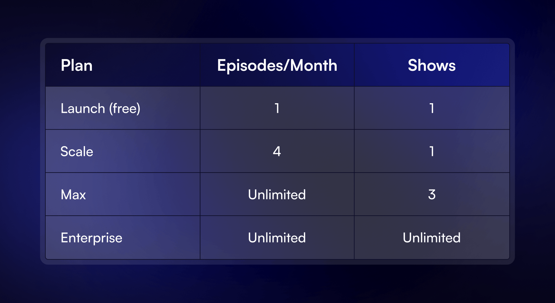 No download-based pricing. No per-episode fees. No storage caps that force you to pay more as your catalog grows. Just simple, predictable pricing.
